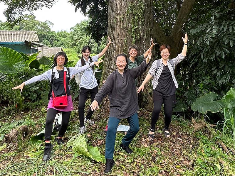 南華大學舉辦戶外定向探索運動,於「南華巨樹桃花心木」前合影。