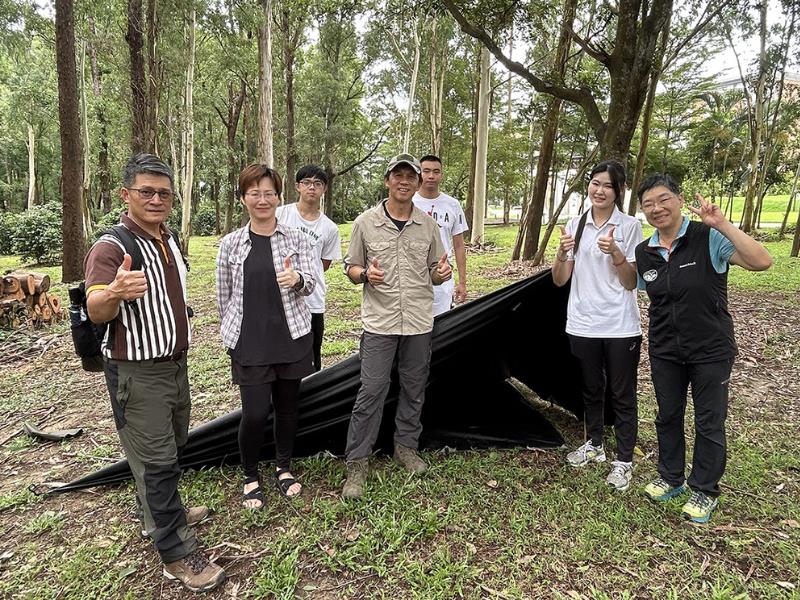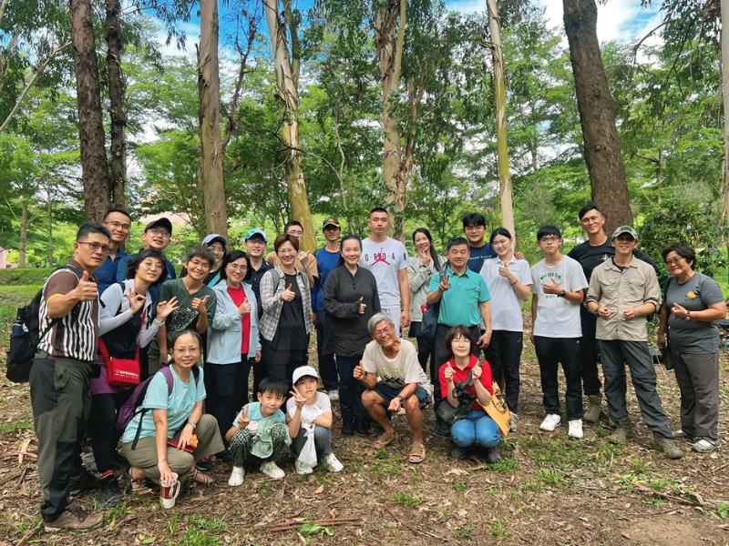 南華大學舉辦戶外定向探索運動,於校園內桉樹林進行攀樹活動並合影。