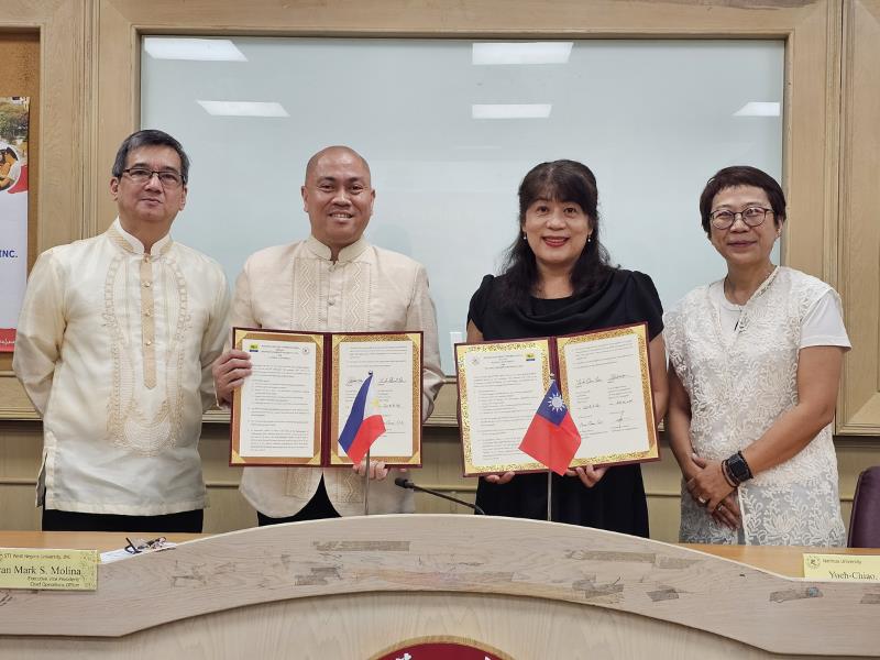 南華大學與菲律賓 STI West Negros University簽署合作備忘錄,左起STIW學術副校長Dr.Frederick C. Berroya、執行副校長暨營運長 Dr. Ryan Mark S. Molina、南華大學葉月嬌副校長、林純純國際長。