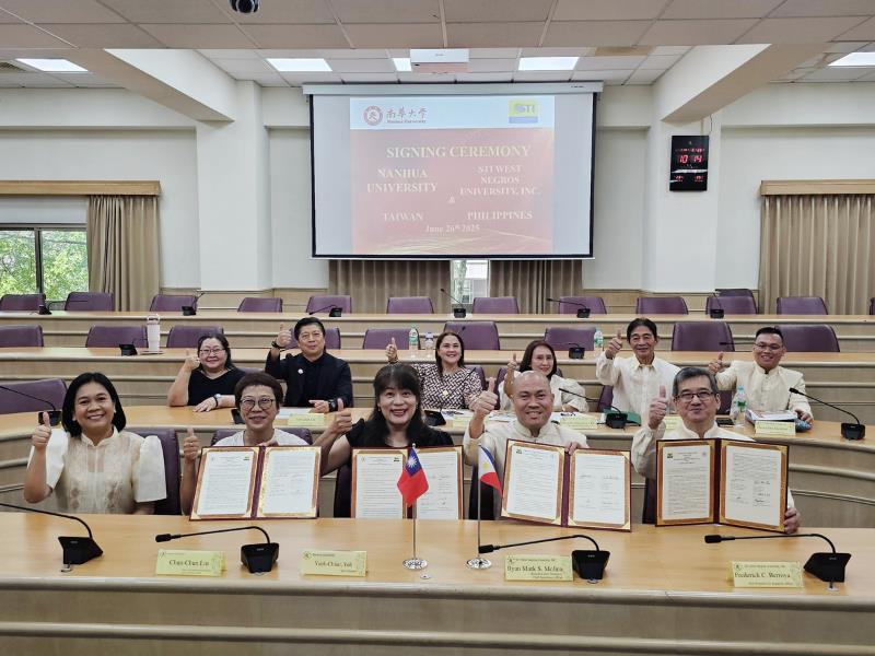南華大學與菲律賓 STI West Negros University簽署姐妹校,由南華大學副校長葉月嬌與STIWNU執行副校長暨營運長Dr. Molina代表簽署合作備忘錄(MOU)及學生交換協議,南華大學國際暨兩岸交流處處長林純純與STIWNU 學術副校長 Dr. Frederick Berroya共同見證,象徵兩校正式建立深厚的夥伴關係。