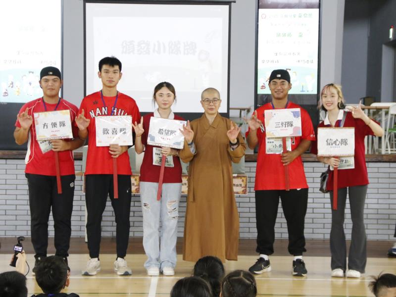 南華大學舉辦「三好兒童 樂樂棒一夏」夏令營,小隊輔與佛光山員林講堂監寺妙玄法師(右3)合影。