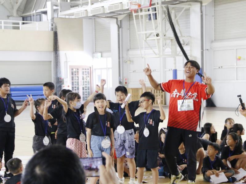 本次營隊特別安排「身心靈運動健康-生命教育」講座,這也是南華大學體育運動發展處高等教育深耕計畫的重要推動項目,由副處長黃孟立主講,講座融合運動、心理健康與生命教育理念,引導學童了解正向思考、壓力管理與情緒健康,並設計有獎問答與互動遊戲,讓孩子們在歡笑中收穫滿滿。