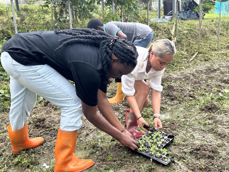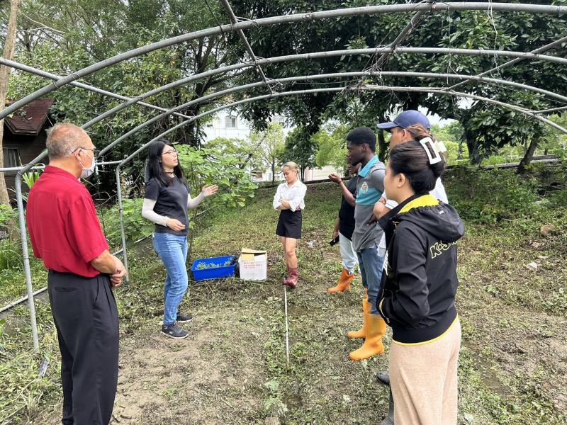 南華大學科技學院USR計畫團隊進行油菊栽種實驗,來自迦納與菲律賓的外籍生參與種植油菊苗。