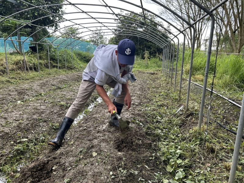 南華大學科技學院USR計畫團隊進行油菊栽種實驗,外籍生參與種植油菊苗。