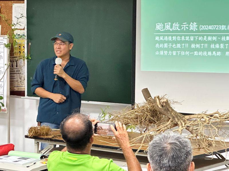 課程雖因颱風影響改為兩日密集授課,首日更持續至晚上九點,學員學習熱情絲毫未減。園藝學系名譽教授呂明雄以其50年柑橘產業經驗,分享文旦整合性管理實務,與學員互動熱烈;園藝學系江一蘆老師則帶來柑橘根域實體樣本,搭配精闢講解,引發高度關注與拍照紀錄。