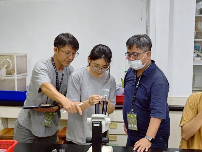 圖4:植醫系林明瑩老師與學員近距離觀察東方果實蠅的幼蟲。