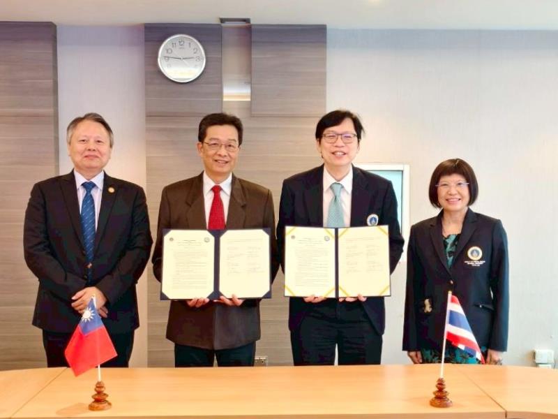 圖1:嘉大生命科學院賴弘智院長(左2)與泰國瑪希多大學熱帶醫學學院Weerapong Phumratanaprapin院長(右2),兩院正式締結學術合作關係 。