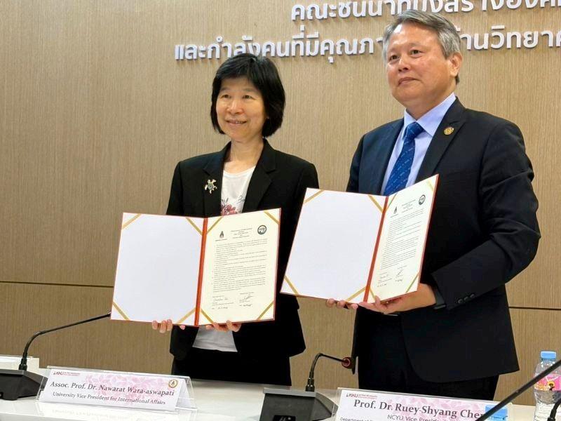 圖2:嘉大陳瑞祥副校長代表與泰國孔敬大學Nawarat Wara-aswapati副校長(左)續簽合作備忘錄。