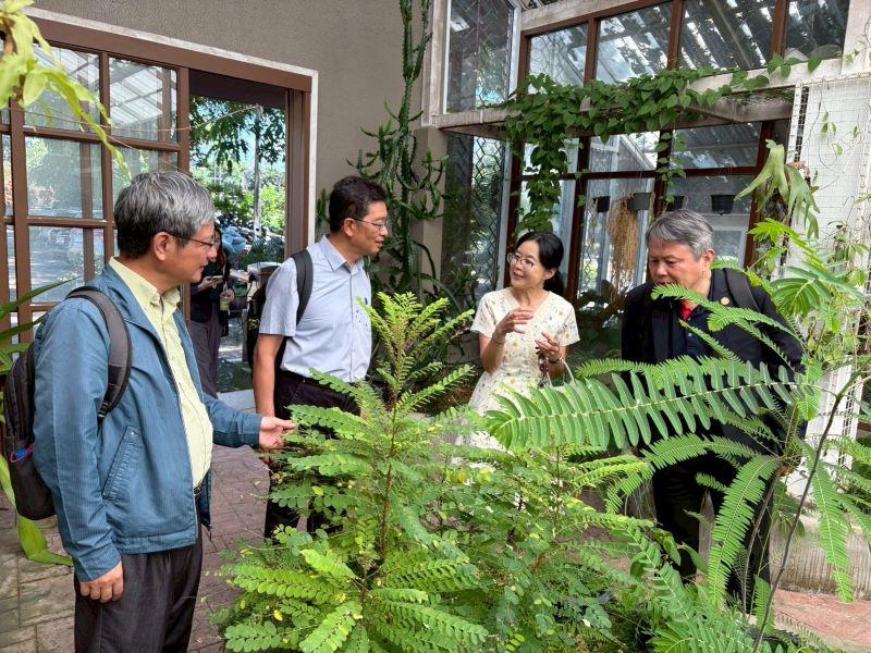 圖5:陳瑞祥副校長(右1)、生科院賴弘智院長(左2)、農學院植物醫學系蔡文錫主任(左1),在孔敬大學理學院Pimwadee Pornponggrungrueng副院長(右2)導覽下參觀生物系植物溫室。
