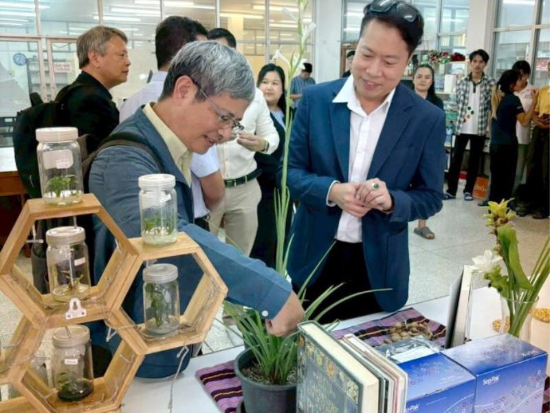 圖7:農學院植物醫學系蔡文錫主任(圖左)與泰國孔敬大學農學院Panupon Hongpakdee副院長(圖右),在孔敬大學農學院園藝系組織培養中心討論花卉植物栽培與蟲害管理。