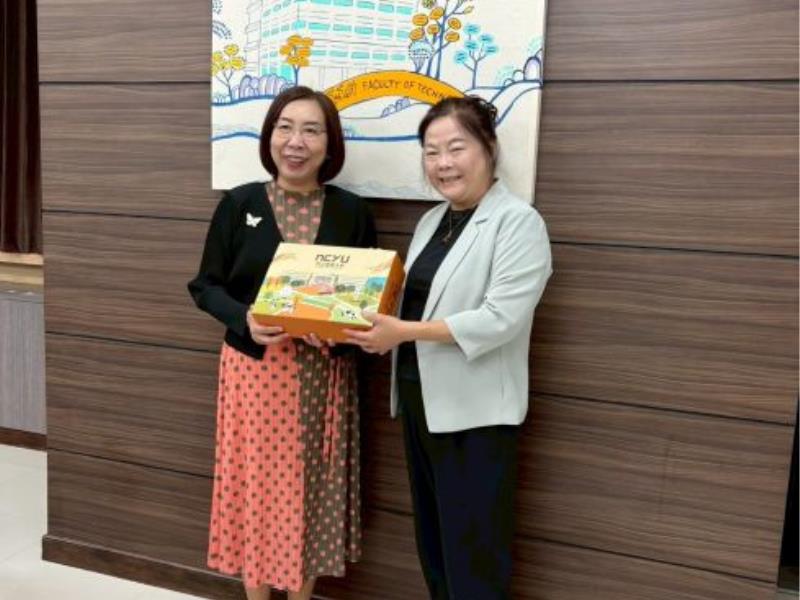 圖8:理工學院應用化學系邱秀貞副教授(右),致贈嘉大紀念品給泰國孔敬大學科技學院副院長Alissara Reungsang教授(左)。