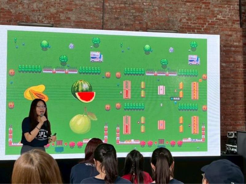 嘉大計畫主持人外語系莊閔惇副教授與協同主持人中文系陳政彥副教授帶領學生團隊(外語系碩一張芷綾、外語系大三林約杏、朱唯甄及李心)以「數位雙語食農教育」為主題參展,透過實地走訪嘉義在地「看天田農場」的深度學習成果,並以互動軟體 Gather Town 打造線上虛擬互動的教學場景,讓教育從課堂延伸到數位世界。參與民眾可化身虛擬角色,在大學伴的引導下進行農場到餐桌的飲食英文學習,寓教於樂的設計廣受親子好評。