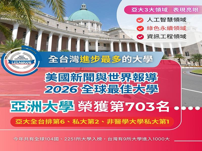 「美國新聞與世界報導」(U.S. News & World Report)公布最新的「2026全球最佳大學」排行榜,亞洲大學排名全球第703名、全台排第6、私大第2、非醫學大學私大第1,比去年進步42名,是全台灣進步最多的大學。其中,亞大資電學院在三大學科核心領域全入榜,分別為:人工智慧(AI)全球第130名、電機工程(EE)第164名、電腦科學(Computer Science)第219名,排名表現亮眼,展現亞大在數位科技領域的國際競爭力。