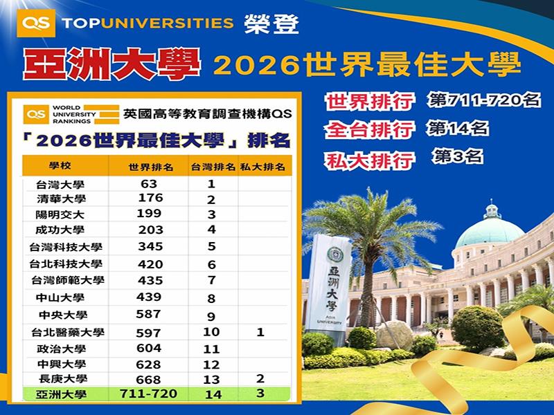 英國高等教育調查機構QS (Quacquarelli Symonds),2025年6月公布最新的「2026世界最佳大學」排名,全台共有15家大學進入前1000大,亞洲大學再進步100名,排名在711-720名間,全台第14名、私大排第3名、私大非醫大排第1名。
