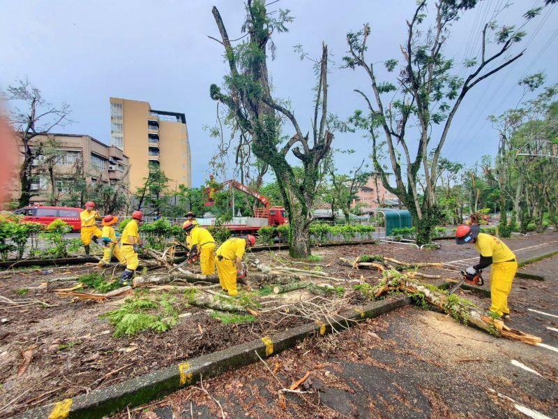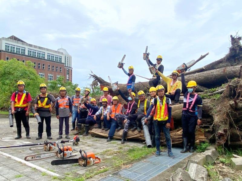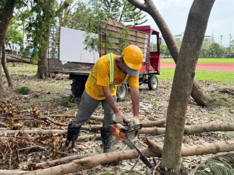 災後嘉大同仁全力投入救災,尤其是總務處同仁無懼酷暑與風雨,不分日夜,持續奮戰在校園各角落。暑假未歇,例假不休,總務處動員所有外勤同仁、委外人力及部分行政人員,日均投入61人力,累計已逾793人次。配合鏈鋸、小型機具,逐一清理倒木、修剪斷枝、扶正喬木等這些原本靜立校園、默然庇蔭的樹,如今在他們的雙手下,一一重獲生機。