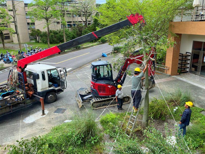圖4:總務處外勤人員至民雄校區圖書館前清理大型倒木。