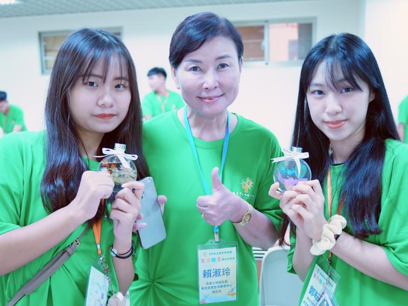 大專校院學生生命教育體驗研習營,體驗手作芳香浮游花瓶,療癒身心靈。學員與南華大學賴淑玲副校長合影(中)。