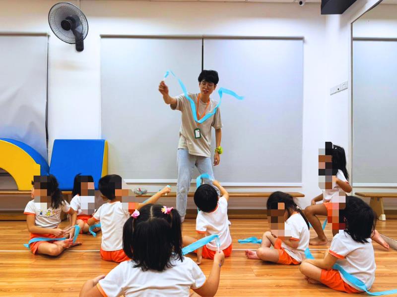 南華大學幼教系赴新加坡實習,陳宥諭同學運用魔術和彩帶,引導幼兒進行繞圈、飛舞的動作。