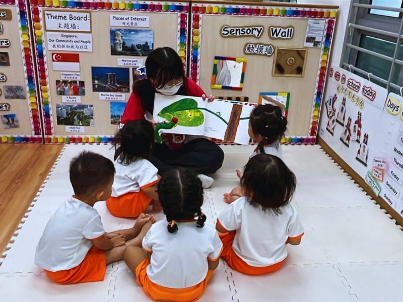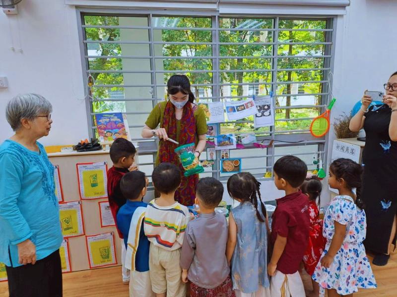 南華大學幼教系赴新加坡實習,廖若妤同學搭配動作或玩偶講繪本給幼兒聽,讓幼兒可以理解繪本內容。