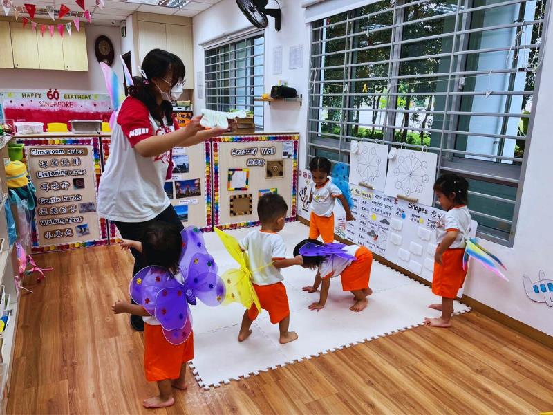 南華大學幼教系赴新加坡實習,廖若妤同學透過昆蟲扮演帶領幼兒學習童謠。