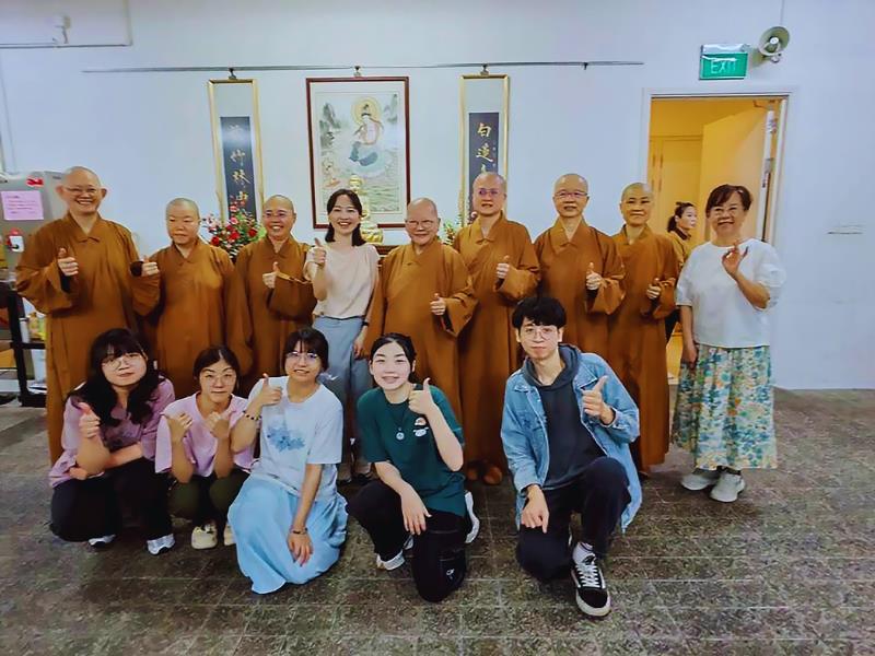 南華大學幼教系赴新加坡實習,新加坡佛光山住持同時也是慈愛幼兒學校負責人妙穆法師(後排左5),帶領道場法師一起迎接南華師生。