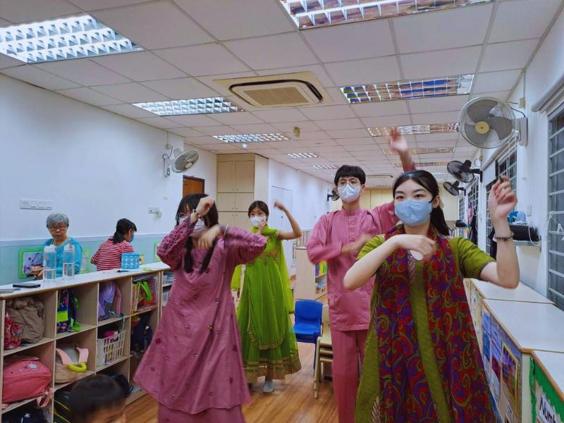 南華大學幼教系赴新加坡實習,配合新加坡種族和諧日,學生們穿上四大種族的衣服,一同跳舞和帶領幼兒闖關,品嚐不同種族的食物。