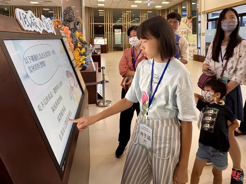 南華大學辦理「淨零綠生活X平安手作」活動,學員在生活微塵中的環保奇蹟常設展體驗「低碳小廚師」互動遊戲。