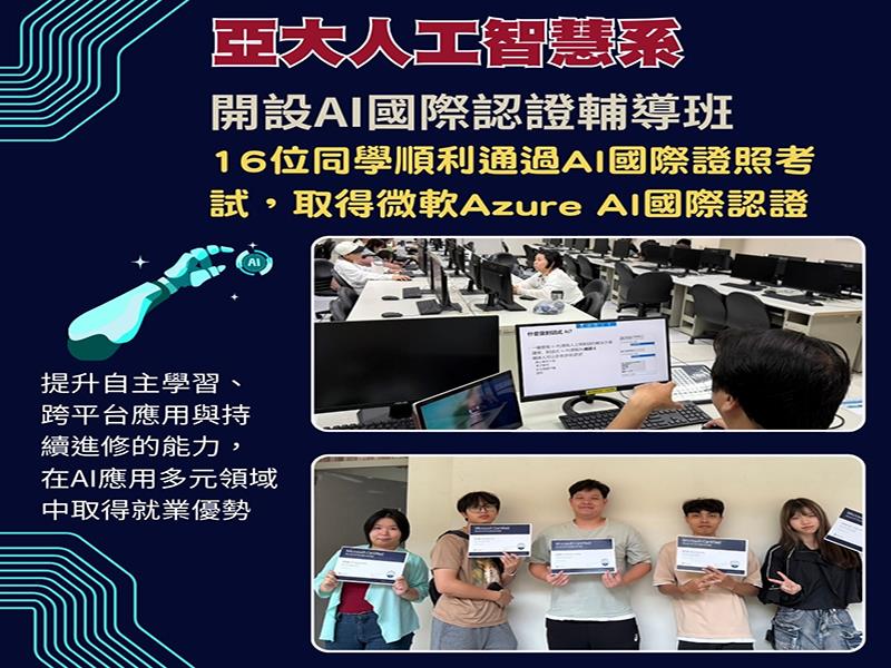 亞洲大學人工智慧學系為強化學生的專業技能,並提升未來在AI與雲端領域的競爭力,特別開設「AI 證照輔導班」,協助同學熟悉微軟Azure平台的操作,並輔導16位同學順利通過AI國際證照考試,取得微軟Azure AI國際認證。