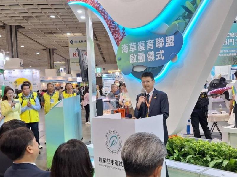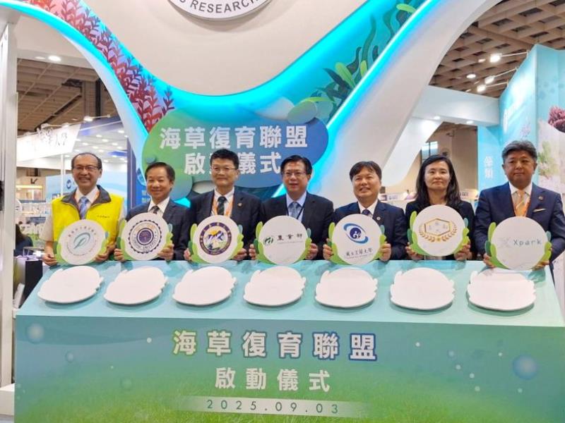 「2025臺灣國際漁業科技展」9月3日至5日在南港展覽館盛大登場,今年以「草匯藍碳、藻護健康」為主題,展現我國在海草復育、藻類繁養殖與淨零碳匯上的科研成果。嘉義大學林翰謙校長、生命科學院吳思敬院長與水生生物科學系楊松穎助理教授共同出席開幕式,並在農業部黃昭欽次長的見證下,嘉大與宜蘭大學、嘉南藥理大學、東海大學、Xpark水族館及農業部水產試驗所攜手啟動「海草復育聯盟」,展開跨域合作。