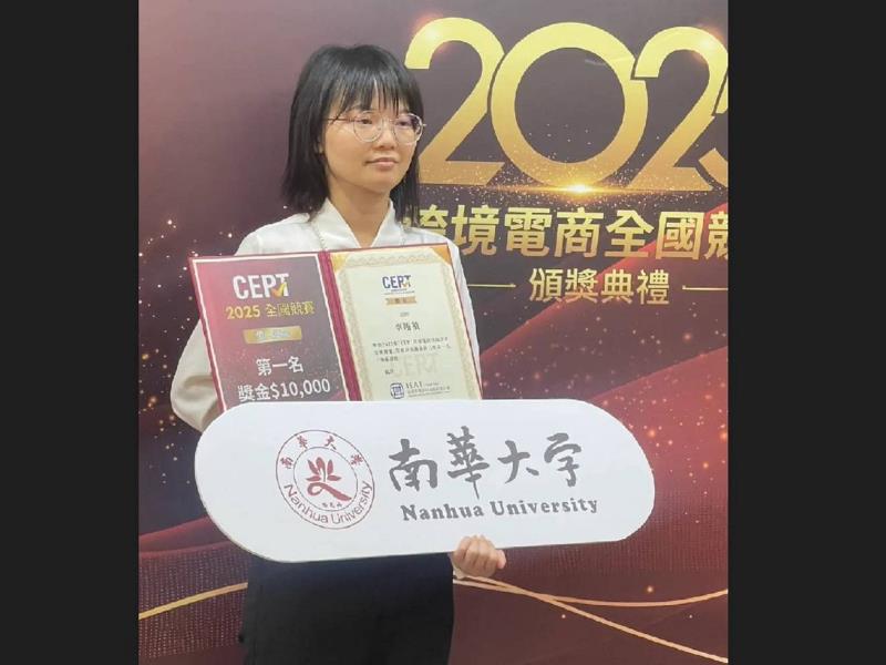 南華大學國際事務與企業學系學生在社會科學院院長暨國際系主任張心怡推薦下,於日前參加由台北市進出口商業同業公會(IEAT)主辦的「2025 CEPT 跨境電商技能認證全國競賽」,共有三位同學順利通過認證。其中,李翊禎更勇奪 CEPT–Amazon 模組個人冠軍,以優異表現為校爭光,並於9月11日出席頒獎典禮接受表揚。