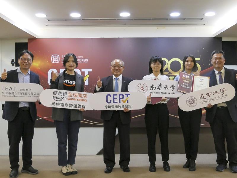 台北市進出口商業同業公會(IEAT)舉辦「跨境電商技能認證(CEPT)」計畫,李翊禛同學(右3)榮獲亞馬遜模組第一名。