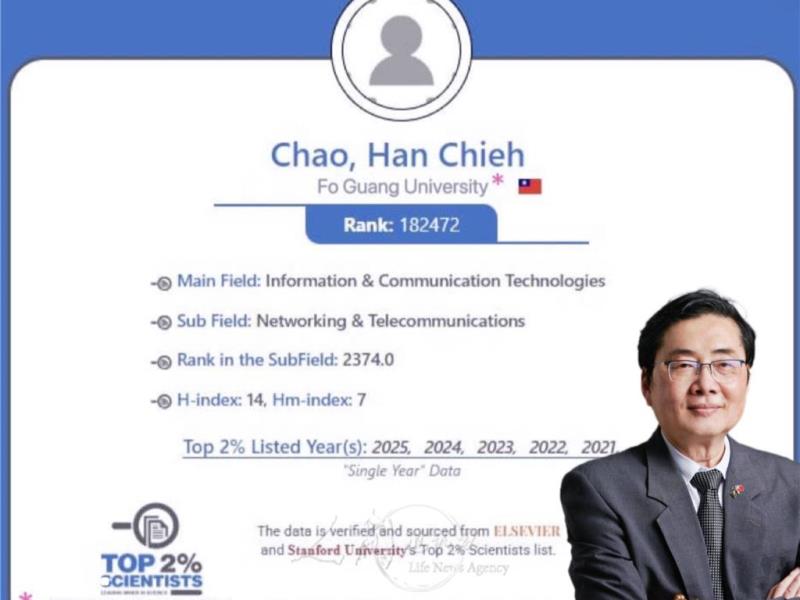 佛光大學校長趙涵?教授脫穎而出,再次入選 2025 年度「世界前 2% 頂尖科學家」,並連續 5 年榮獲此譽,展現其在學術界的卓越成就與持續研究貢獻。此次評選由全球知名的 TopSciNet.com 平台公布,該平台結合 Elsevier 及美國史丹佛大學的研究團隊,對超過 700 萬名科學家進行綜合評估,包括論文引用次數、H-index、合作影響力及跨領域研究等指標,以確定全球學者中的頂尖人才。趙校長以其在「資訊與通訊科技」領域,特別是「網路與電信」專業的深厚研究實力,成功斬獲殊榮。這一成就不僅彰顯佛光大學在國際學術領域的競爭力,也為學術研究環境注入強勁動力,進一步提升佛大的學術影響力與國際化地位。