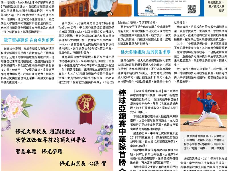 佛光山宗長心保和尚、佛光大學董事會及佛光山教團系統大學特別刊登賀詞於報端,隆重表達對趙涵?校長傑出學術成就的敬意與祝賀,彰顯此一榮耀對佛光大學及佛光山教育體系的重要意義。
