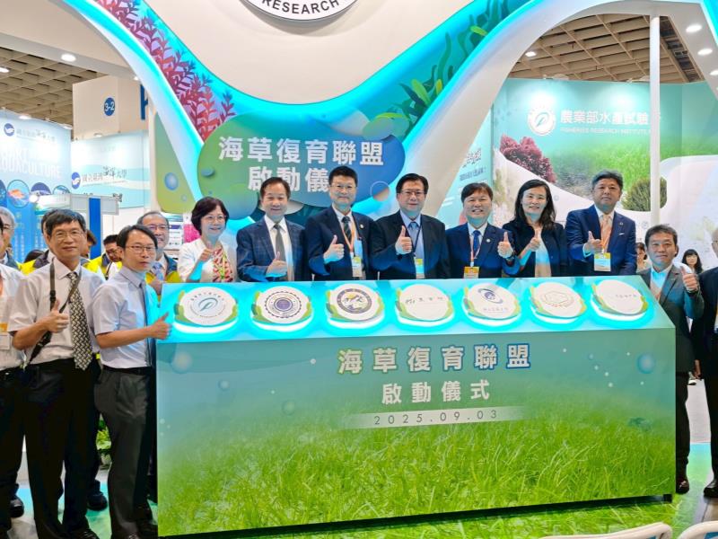 農業部水產試驗所參展「2025臺灣國際漁業科技展」於2025年9月3日開幕,水試所與嘉義大學、宜蘭大學、嘉南藥理大學、東海大學及台灣橫?八景島公司成立「海草復育聯盟」,將透過海草床復育,協助增加海洋碳匯(藍碳)吸存量,水試所所長張錦宜表示,農業部初步盤點以臺灣本島20公頃、澎湖40公頃為目標,聯合四所大學,並引進企業協力,因地制宜復育海草床。