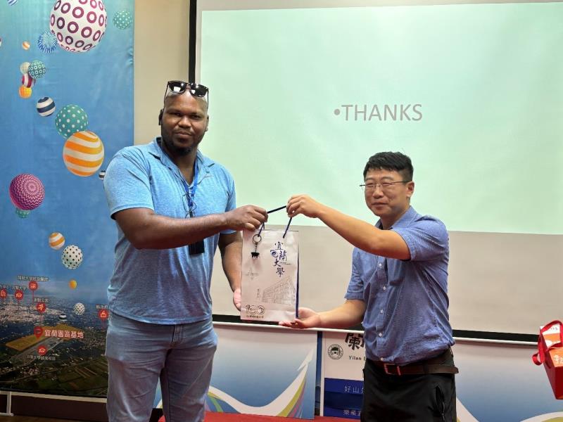 ▲國立宜蘭大學無人機應用研究中心主任鍾智昕教授致贈紀念品予拉丁美洲代表團 Professor Chih-Hsin Chung, Director of the UAV Application Research Center at National Ilan University, Presented a Gift to the Latin American Delegation