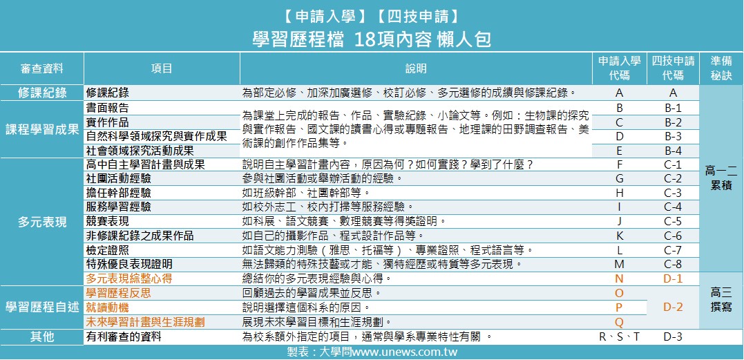 記錄著高中學習軌跡的學檔,包括:「修課紀錄」、「課程學習成果」、「多元表現」、「學習歷程自述」等四大部分,以及「其他」有利審查的資料,共有18項,「申請入學」和「四技申請」的代碼各有不同。(如下表)。其中,「修課紀錄」、「課程學習成果」、「多元表現」都是要從高一開始逐步累積、依學校規定上傳;而多元表現綜整心得及學習歷程自述(即「申請入學」的N、O、P、Q或「四技申請」的D-1、D-2)則是高三下時,再依申請校系撰寫。