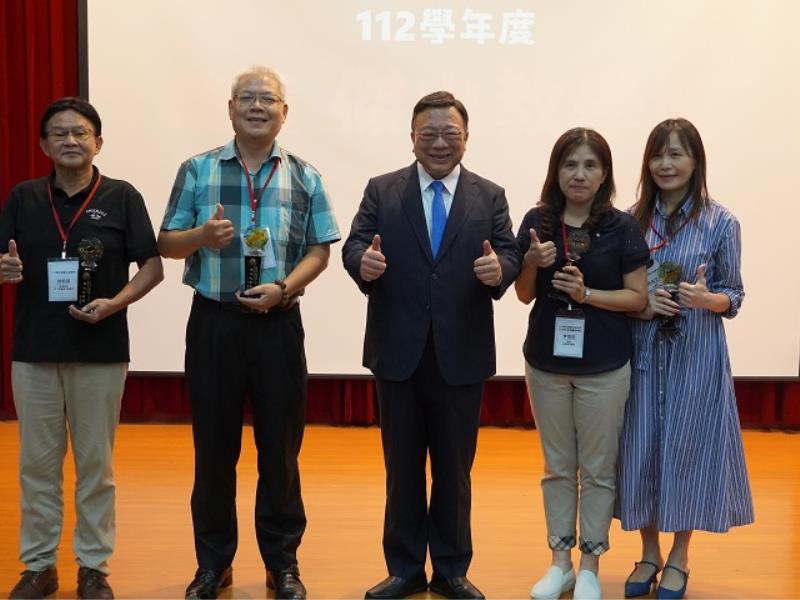 ▲中華大學校長劉維琪(中)頒發「112學年度傑出教學獎」予(由左至右)林炳章、張筵儀、李愷莉及陳俐文老師。