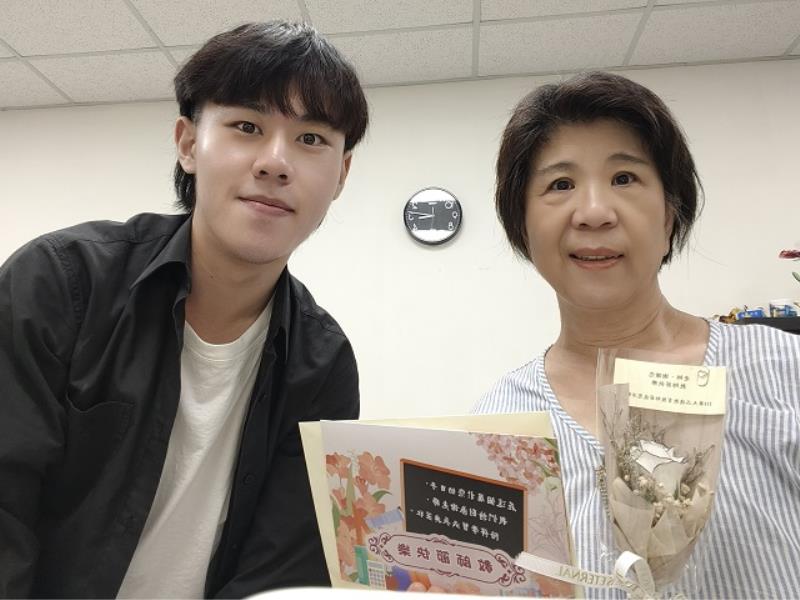 ▲工業產品設計學系老師杜嘉琪(右)收到資訊工程學系學生胡智盛的感謝花束與卡片,表示教學的回饋是最珍貴的鼓勵。