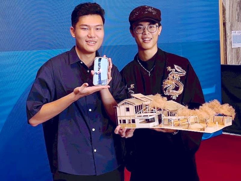 南華大學建築系榮獲學生組創新設計首獎,獲獎學生徐瀚佐(右)、陳亮宇(左)、周承雋(手機中)與獲獎作品合影。