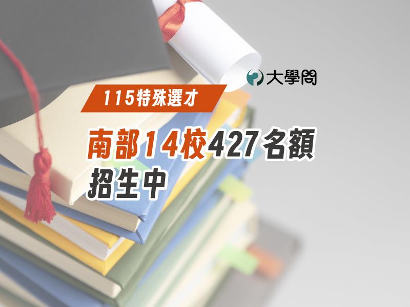 南部今年有14所大學146系組,共提供427個名額。包括成大、中山、高師大、中正、屏大等9所國立大學,以及高醫、義守、長榮等5所私立大學。★【115特殊選才】南部14校427名額,招生中