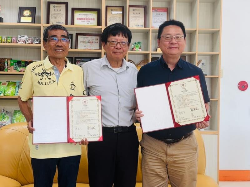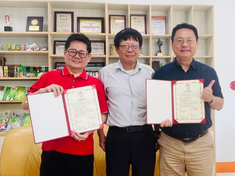 南華大學科技學院陳柏青院長(右)代表與「威獅農場」的蔡承威廠長(左)簽訂產學合作協議書,南華大學文化創意事業管理學系趙家民教授 (中)見證。