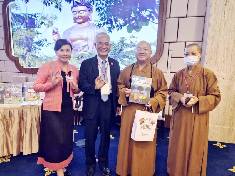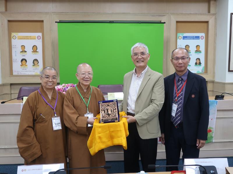南華大學舉辦人間佛教學術系列講座,邀請佛光山文化院院長依空法師(左2)主講,高俊雄校長(右2)致贈紀念品。