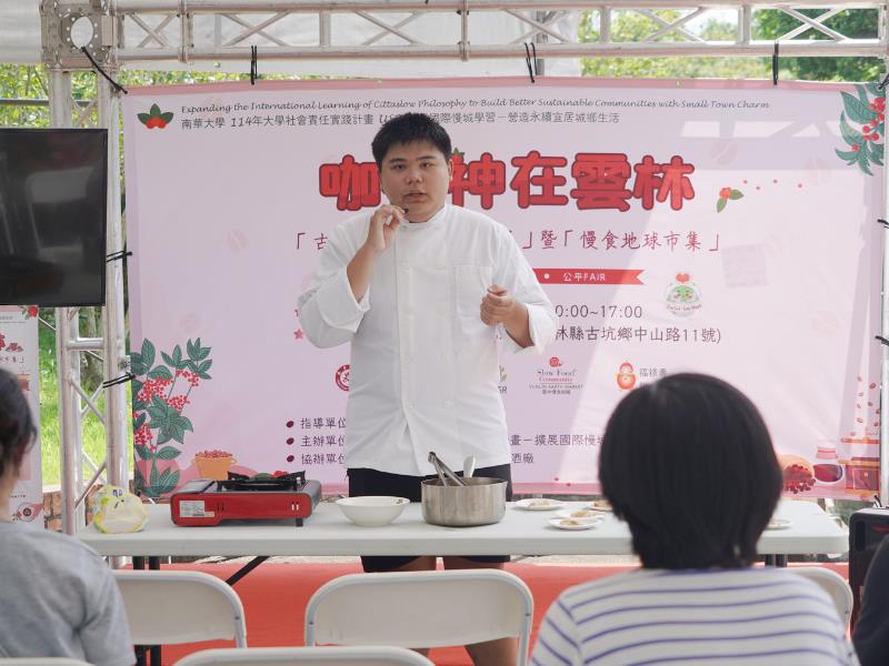 該活動內容豐富多元,南華大學旅遊管理學系學生黃威凱現場示範創意料理「果香咖啡威化捲」,將咖啡入菜,結合當季蔬果,呈現低碳又具在地風味的飲食創意,讓參與者感受咖啡在餐桌上的多元可能。咖啡渣線香課程則由USR團隊帶領民眾親手體驗,將日常廢棄的咖啡渣轉化為天然驅蚊香,不僅傳遞環保概念,更落實循環經濟。深受歡迎的「慢食地球市集」聚集雲嘉地區小農,展售咖啡、蔬菜、手工藝品與特色農產,讓生產者與消費者面對面交流,實踐「優質、乾淨、公平」的慢食精神。