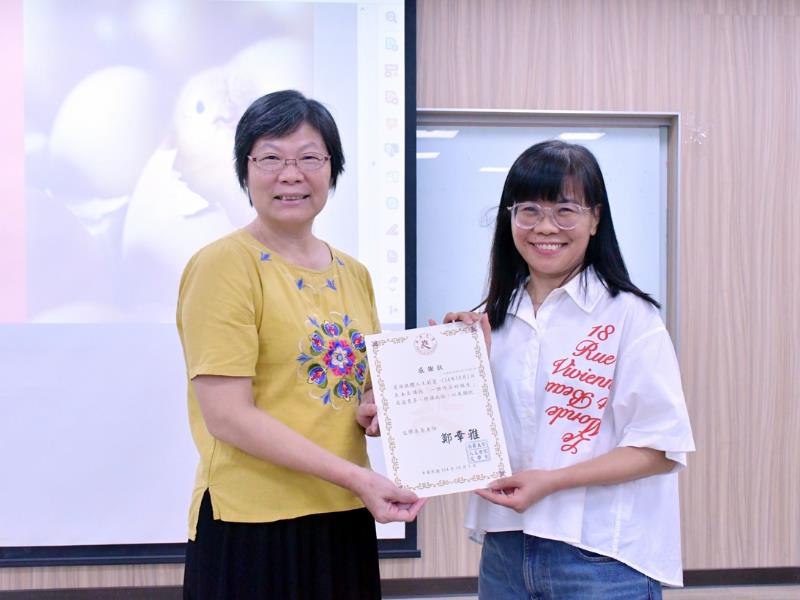 南華大學文學系邀請資深媒體人王莉茗(右)蒞校演講,鄭幸雅主任(左)致贈感謝狀。