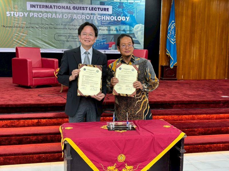 9月17日上午穆罕默德迪亞大學舉辦國際學者專題演講,由農生系何一正主任及周蘭嗣副教授擔任主講,以”Horticultural Excellent and Biotechnology: Innovations and Global Impact”主題,分別提出”Nanotechnology and Microbiology for Sustainable Agriculture: Synergies for Plant Health and Productivity”之2堂精彩的國際課程。何一正主任以「奈米技術在農業上的應用」為題,深入探討如何藉由奈米科技提升農業產能、促進永續發展。周蘭嗣副教授則分享「微生物快速檢驗的原理與應用,強調微生物檢測在病害防治及作物健康管理上的價值。現場農業與動物科學院師生反應熱烈,對演講內容與研究展現高度興趣。演講結束後,何一正主任與UMM Agrotechnology系Dr. Ir. Agus Zainudin, MP.共同簽署授課合作協議,為日後共同開課、師資交流與研究合作奠定穩固基礎。農生系5位碩士生則參與由Dr. Ir. Wahono, MT.主持的課程體驗,獲得國際課程參與證書,實地感受印尼校園的學習氛圍與文化差異。