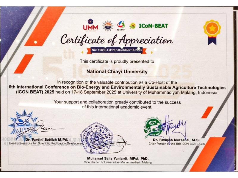 嘉義大學農業生物科技學系何一正主任、莊慧文教授、王文德教授、吳希天教授、周蘭嗣副教授、張岳隆助理教授、施寅澤助理教授,以及林園鈞、廖婉均、嚴云騰、張珍綾、曾珮妤等5位研究生,9月17-18日參加在印尼瑪琅穆罕默德迪亞大學(University of Muhammadiyah Malang, UMM)盛大舉行的「關注於生物能源與環境農業技術的國際研討會」(The 6th International Conference on Bio-Energy and Environmentally Agricultural Technologies, ICoN-BEAT 2025)。嘉大農生系教師發表1場Plenary Speech與2場Keynote Speech,師生合計發表8篇poster,充分展現該系在動植物科學、奈米科技及永續農業領域的研究深度與國際學術影響力,獲得與會國際學者高度肯定。