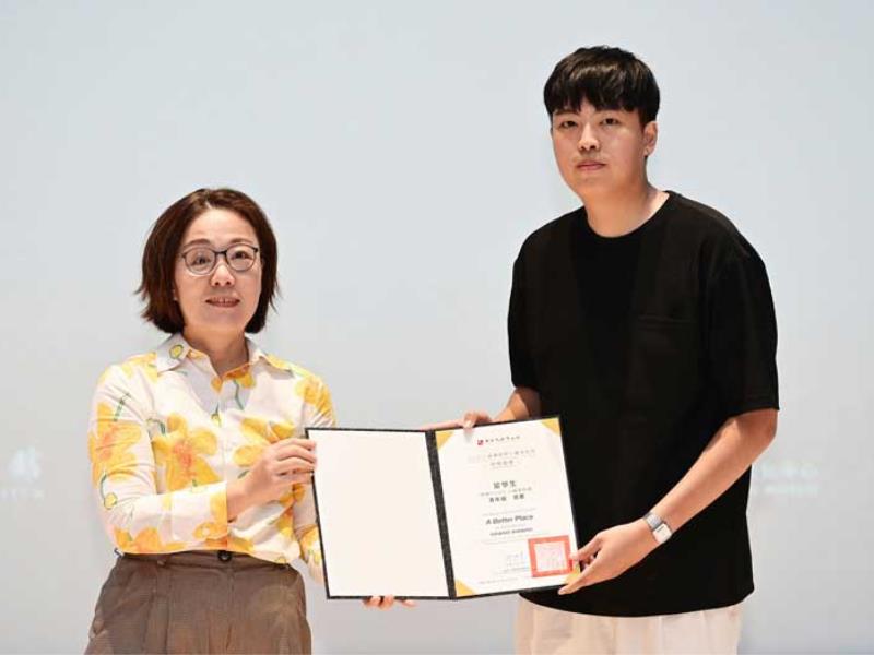 首屆「人權電影獎」青年組首獎由世新大學廣電系校友黃勇嵻(右)執導作品《留學生》勇奪殊榮。(文化部提供)