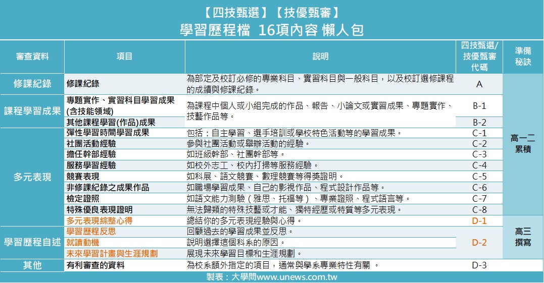 記錄著技高學習軌跡的學檔,包括:「修課紀錄」、「課程學習成果」、「多元表現」、「學習歷程自述」等四大部分,以及「其他」有利審查的資料,共有16項,「四技甄選」和「技優甄審」的代碼一樣(見下表)。其中,「修課紀錄」、「課程學習成果」、「多元表現」都是要從高一開始逐步累積、依學校規定上傳;而多元表現綜整心得(D-1)及學習歷程自述(D-2)則是高三下時,再依申請校系撰寫。