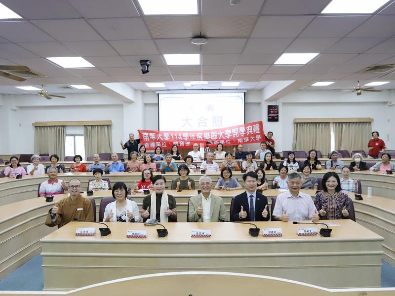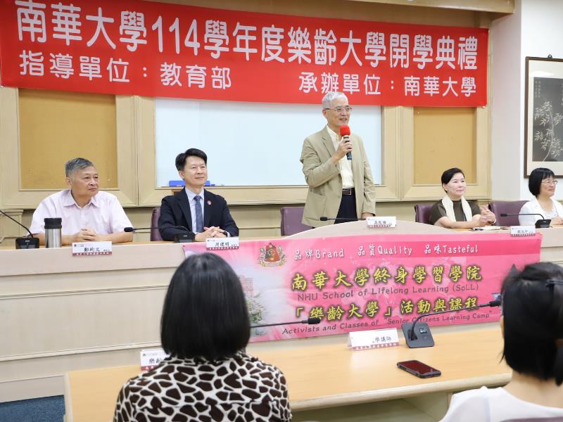 南華大學校長高俊雄表示,南華不僅是青年學子的求學園地,也是長者實現自我、延續生命價值的學習殿堂,期望長者們透過學習,讓自己更健康且能充滿創造力,真正落實「學習無年齡、教育無界限」的精神。副校長賴淑玲也特別以星雲大師所說「只有不斷地學習才能讓生命不老。」勉勵長者持續多元學習,這份活到老、學到老的精神,正是南華大學樂齡大學最美的風景。