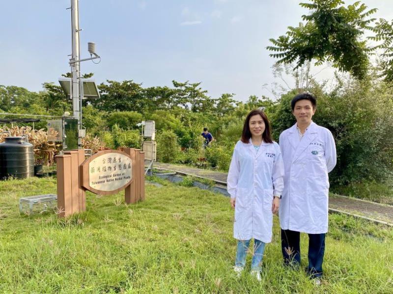 圖1:嘉義大學中西醫藥科學碩士學位學程劉怡文教授、廖厚勳醫師於嘉大臺灣原生藥用植物生態園區合影。